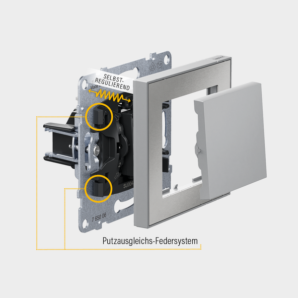 - Technopolymer: Die Abdeckrahmen aus Kunststoff werden in einem speziellen Verfahren gefertigt, das auch einen Tiefeneffekt in der Oberfläche gewährleistet.